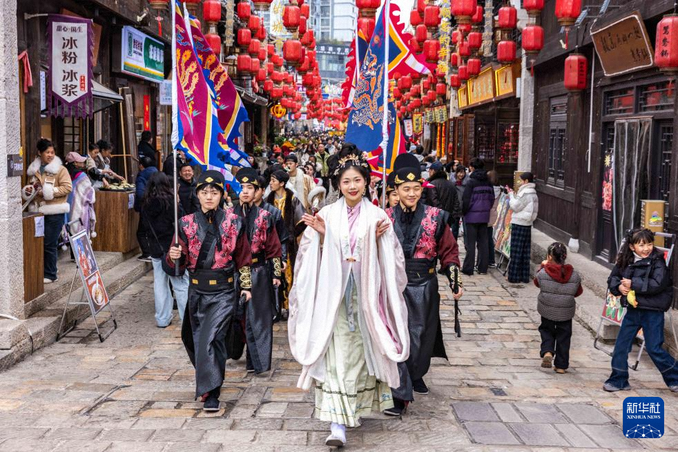 1月30日,工作人员在贵州省安顺市西秀区安顺古城历史文化街区开展汉服巡游展示。新华社发(陈熙 摄)