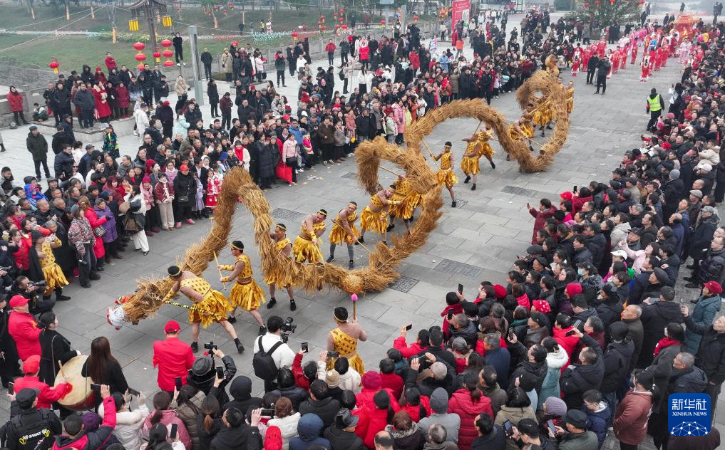 1月29日,民间艺人在四川省南充市蓬安县相如故城表演舞草龙(无人机照片)。新华社发(刘永红摄)