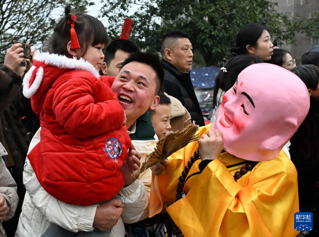 1月29日,在四川省南充市蓬安县举行的“文化贺新春 民俗大拜年”新春民俗文艺巡游活动中,表演者与观众互动。新华社发(刘永红摄)