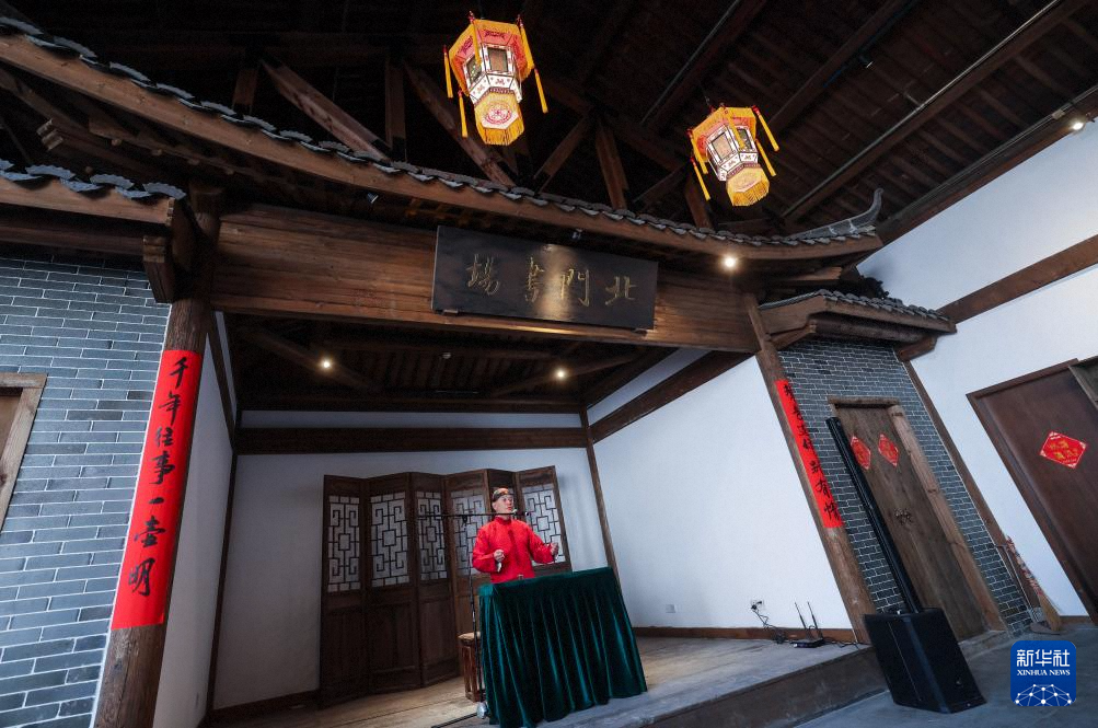 1月30日,演员在浙江嘉兴海宁市盐官镇的盐官潮乐之城为游客表演说书。新华社记者 徐昱 摄
