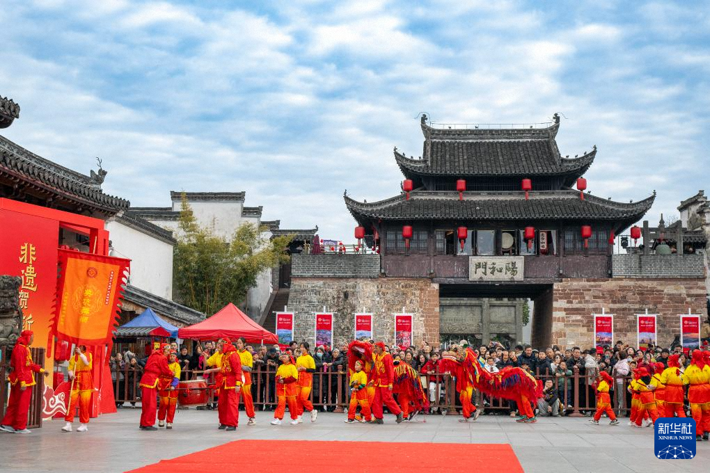 1月30日,游客在安徽省黄山市歙县徽州古城观看舞狮表演。新华社发(肖本祥 摄)