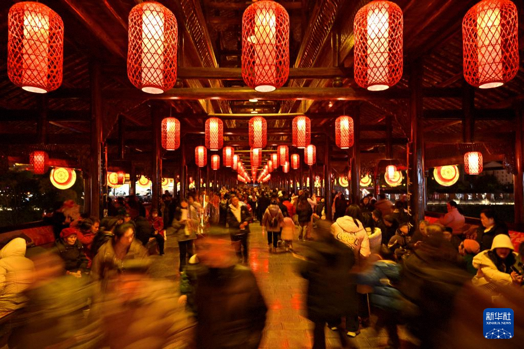 1月29日,人们在湖北省宣恩县城风雨桥游玩。新华社发(宋文摄)