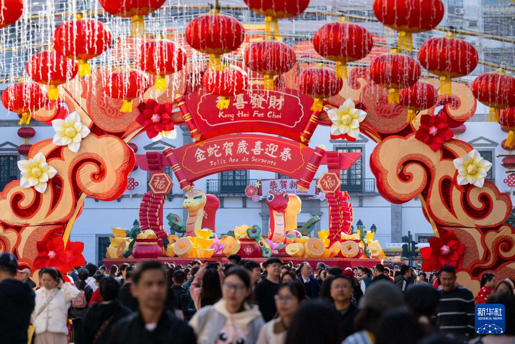 1月30日,游客在澳门大三巴牌坊前游玩。新华社发(张金加摄)