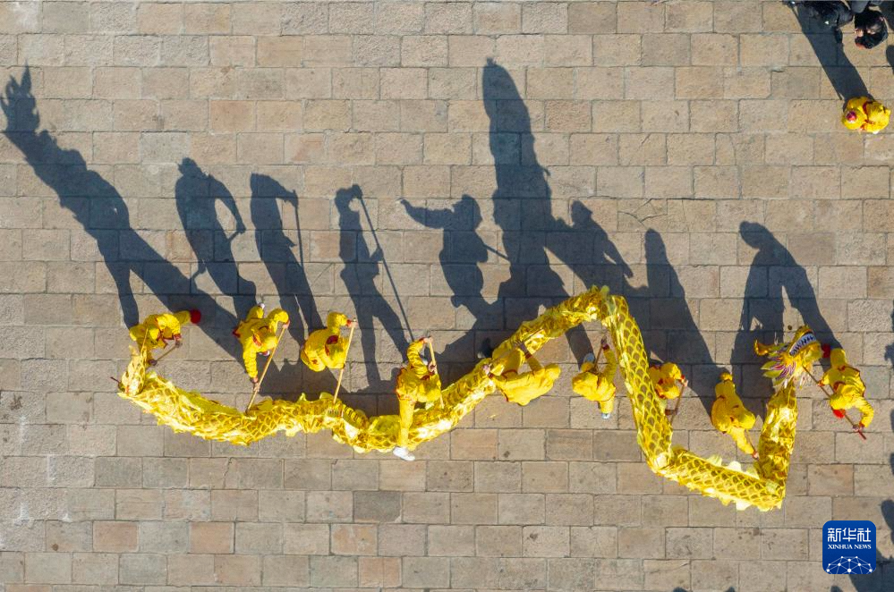 1月30日,在浙江省临海市台州府城,民间艺人在表演国家级非物质文化遗产“临海黄沙狮子”,吸引众多市民和游客观看(无人机照片)。新华社发(王华斌摄)