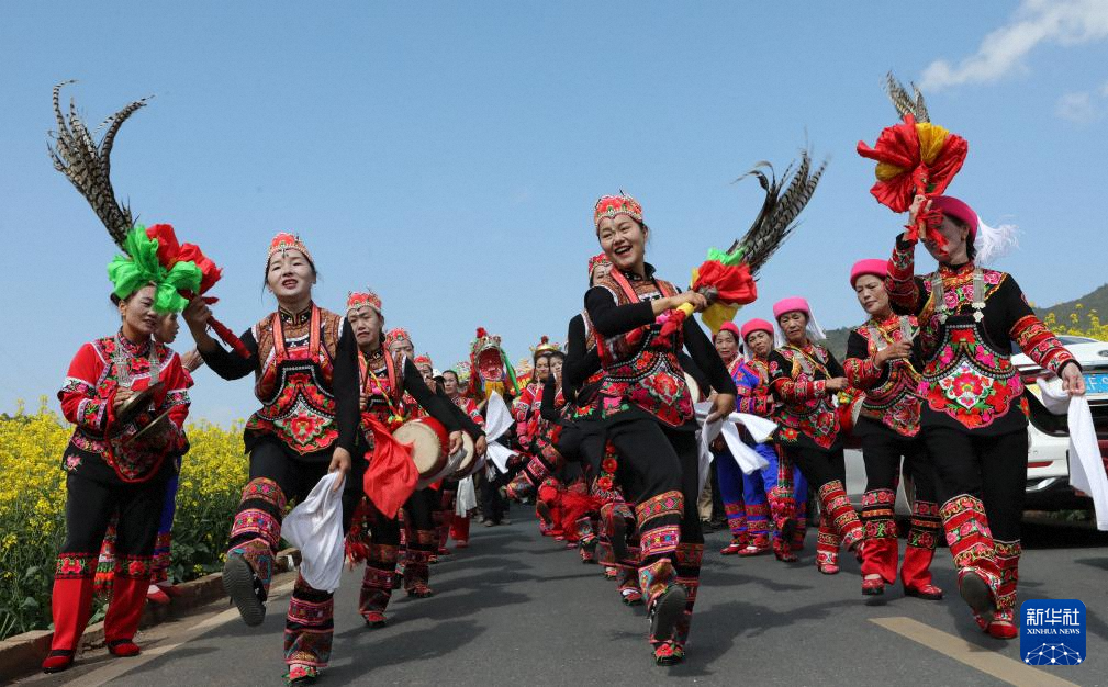 1月30日,云南省玉溪市峨山彝族自治县塔甸镇瓦哨宗村群众在表演彝族歌舞。新华社发(李云生 摄)