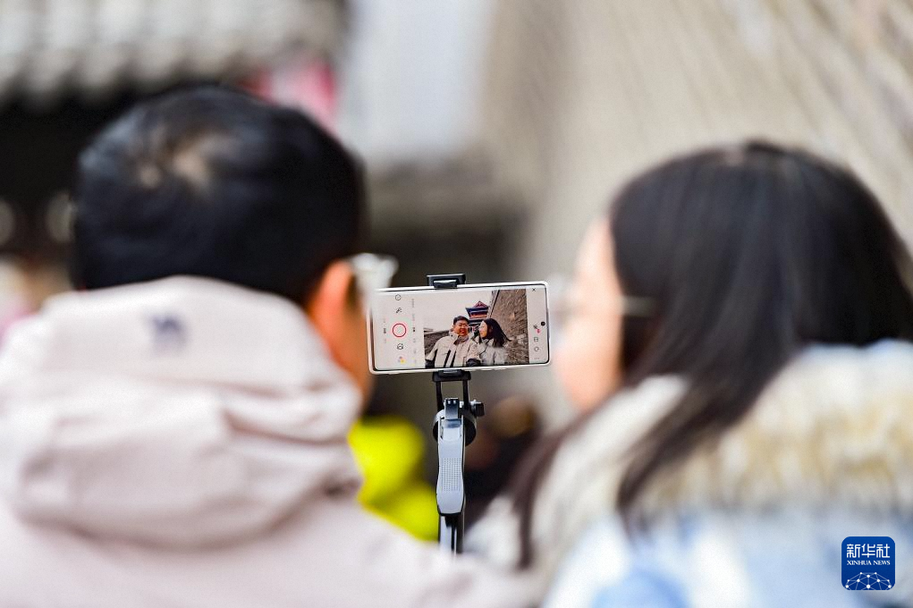 1月30日,游客在山东省青州古城景区自拍留影。新华社发(王继林摄)