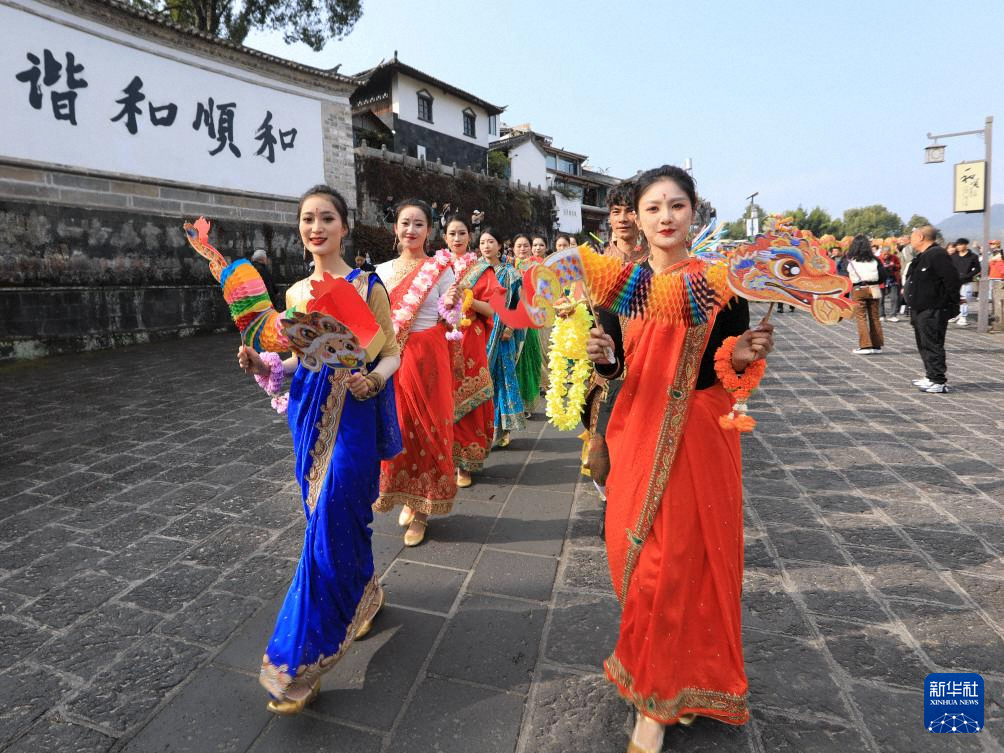 1月30日,在云南省腾冲市和顺镇,游客观看东南亚风情服装花式巡游。新华社发(龚祖金摄)