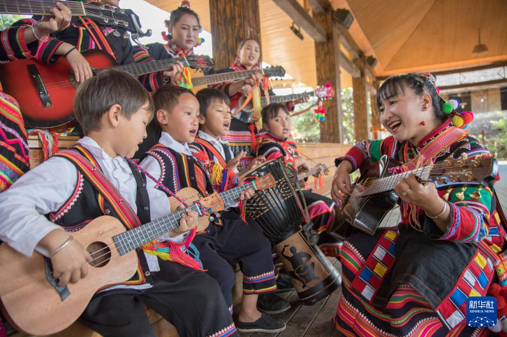 云南省普洱市澜沧县酒井乡勐根村党总支宣传委员,澜沧县拉祜族摆舞非遗文化传承人李娜倮(右一)。新华社发(资料照片)