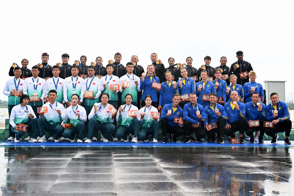 8月10日,冠军泰国队(后)、亚军中国队(前左)和季军乌克兰队在颁奖仪式上合影。当日,2025年成都世运会龙舟10人座200米决赛在兴隆湖湖滨赛场举行。新华社记者 李嘉南 摄