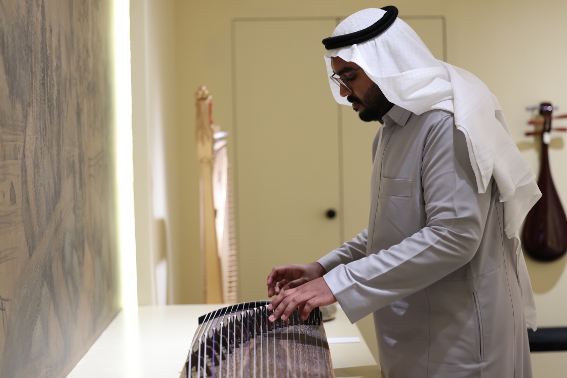 9月28日,在沙特阿拉伯首都利雅得,观众在“天地同和——中国古代乐器展”上体验古筝演奏。新华社记者 王海洲 摄