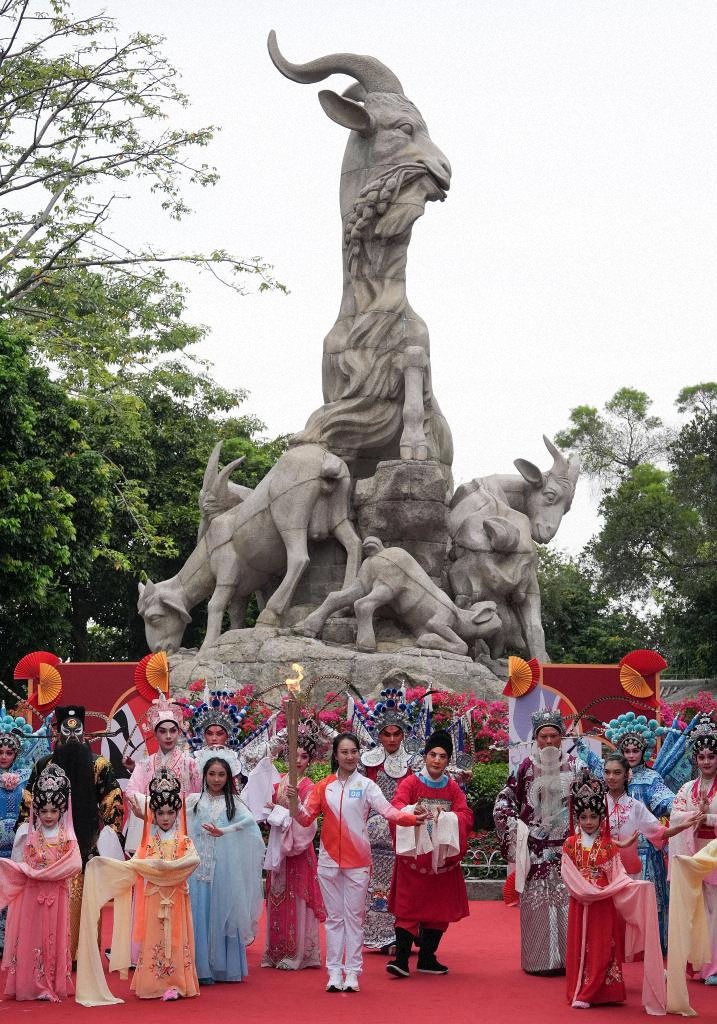 11月2日,火炬手李嘉宜(中)在广州越秀公园内的五羊雕像前传递火炬。当日,中华人民共和国第十五届运动会火炬传递广州站举行。新华社记者 杜宇 摄
