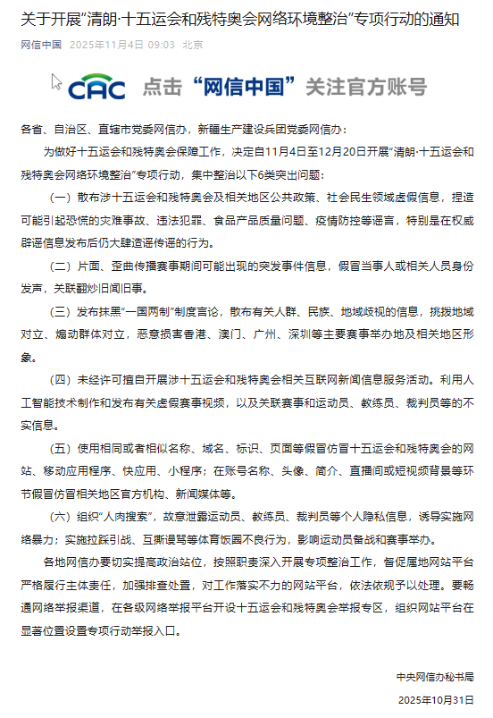 为做好十五运会和残特奥会保障工作,决定自11月4日至12月20日开展“清朗·十五运会和残特奥会网络环境整治”专项行动,集中整治以下6类突出问题: