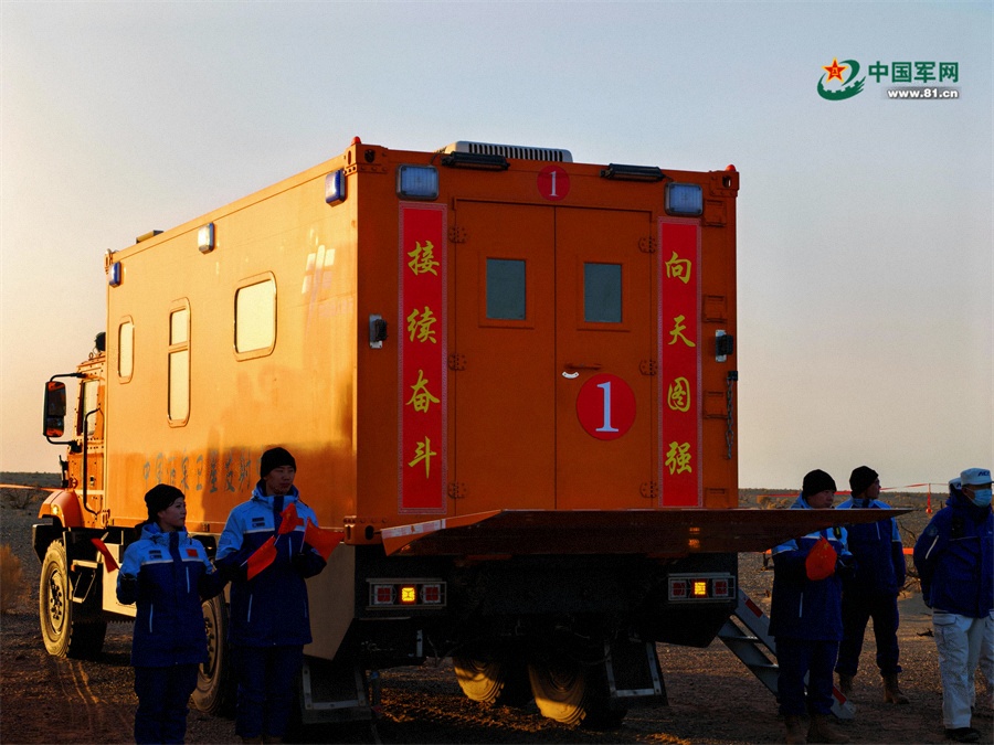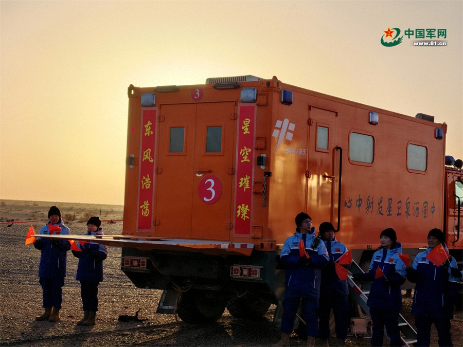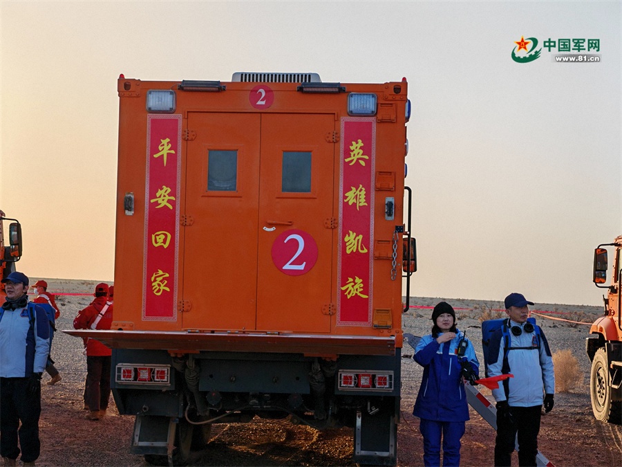 落日逐渐追平了东风着陆场的地平线,神舟二十一号载人飞船返回舱终于成功着陆。“接续奋斗 向天图强”“平安回家 英雄凯旋”“东风浩荡 星空璀璨 ”三幅对联分别贴在神舟二十号航天员乘组的医监医保车上。
