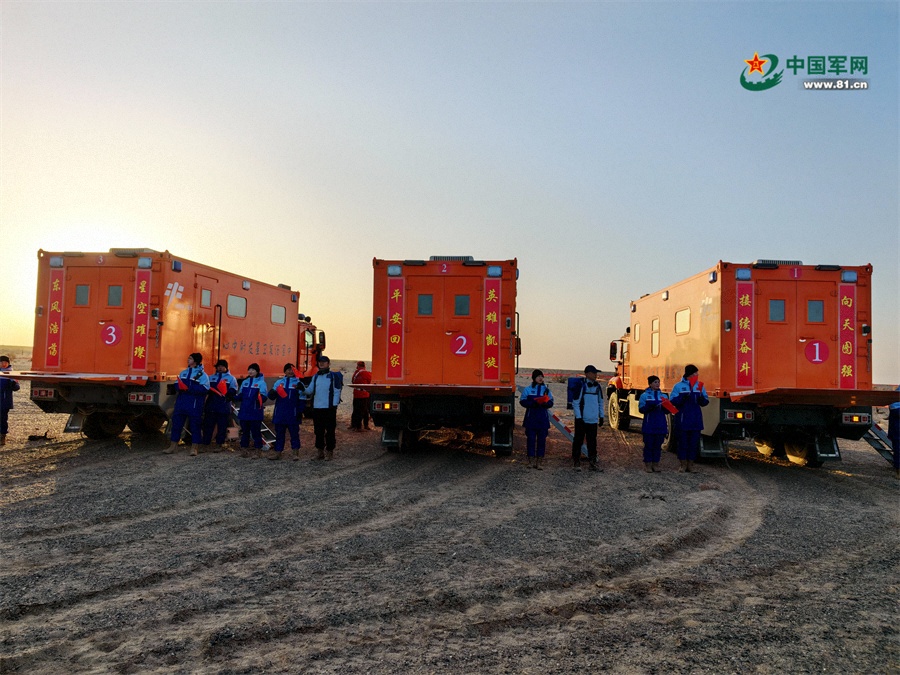 三辆医监医保车在东风着陆场静候神舟二十号航天员乘组归来。 张晨光摄
