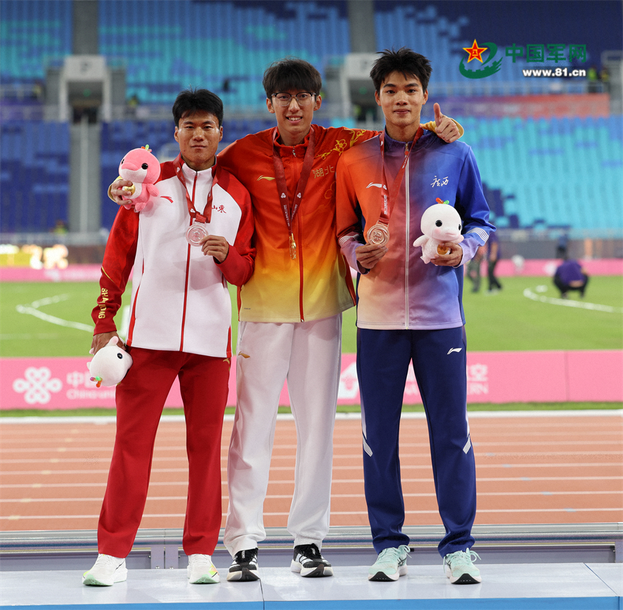 11月17日,冠军湖北队选手李泽洋(中)、亚军山东队选手王胜杰(左)、季军广西队选手曾克理在颁奖仪式上合影。当日,第十五届全国运动会田径男子100米决赛在广州举行。中国军网记者 王元森 摄