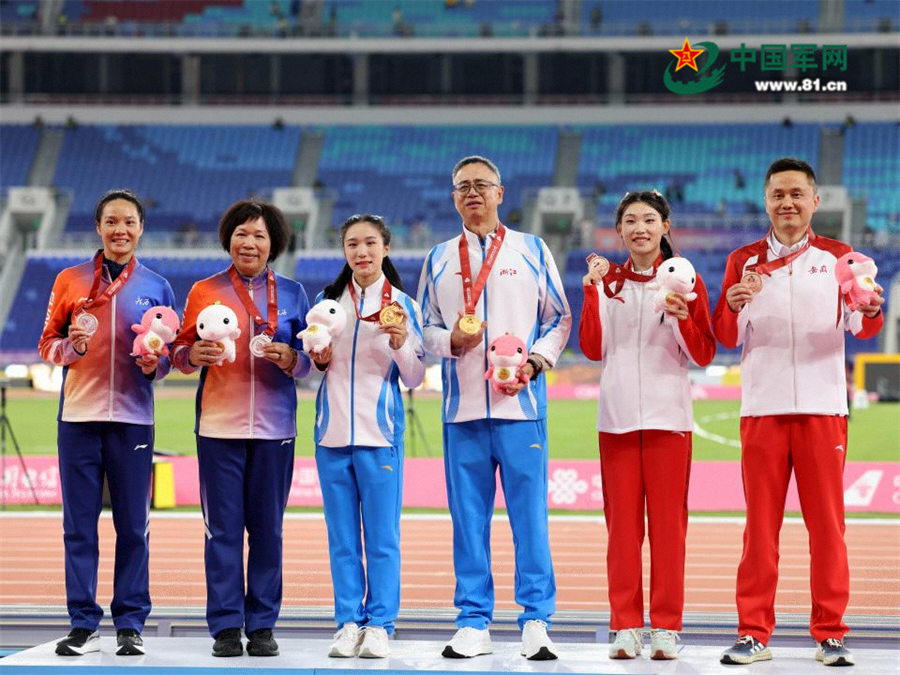 11月17日,冠军浙江队选手陈妤颉(左三)、亚军广西队选手韦永丽(左一)、季军安徽队选手史琳琪(右二)在颁奖仪式上与教练合影。当日,第十五届全国运动会田径女子100米决赛在广州举行。中国军网记者 王元森 摄