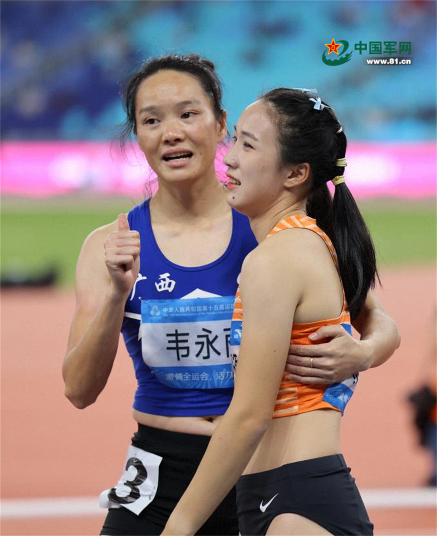 11月17日,浙江队选手陈妤颉(右)和广西队选手韦永丽在赛后拥抱。她们分获冠军和亚军。当日,第十五届全国运动会田径女子100米决赛在广州举行。中国军网记者 王元森 摄