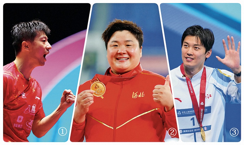图①:11月15日,在澳门进行的第十五届全国运动会乒乓球男子团体小组赛中,北京队3比2战胜上海队。图为北京队选手马龙在单打比赛中庆祝得分。图②:11月16日,第十五届全国运动会田径女子铅球决赛在广州举行。图为冠军河北队选手巩立姣在颁奖仪式上。图③:11月14日,第十五届全国运动会游泳男子200米个人混合泳决赛在广东省深圳市举行。图为冠军浙江队选手汪顺在颁奖仪式后向观众致意。图片来源:新华社