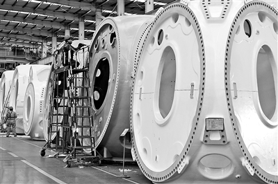 十一月十九日,在山东省惠民县风电装备制造产业园涂装车间,工人在涂装风电轮毂。新华社记者 郭绪雷摄
