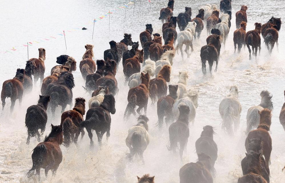 2026年2月12日,骏马在南通森林野生动物园踏水驰骋。新华社发(许丛军 摄)