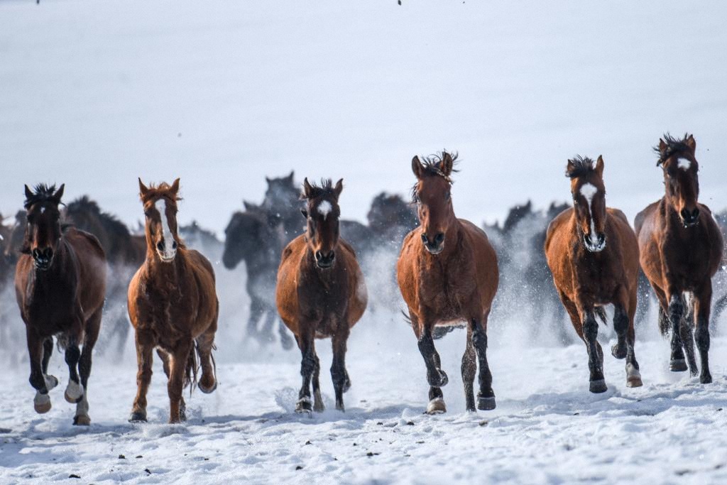 这是2020年12月26日在新疆伊犁哈萨克自治州昭苏县天马旅游文化园拍摄的驰骋的骏马。新华社记者 丁磊 摄