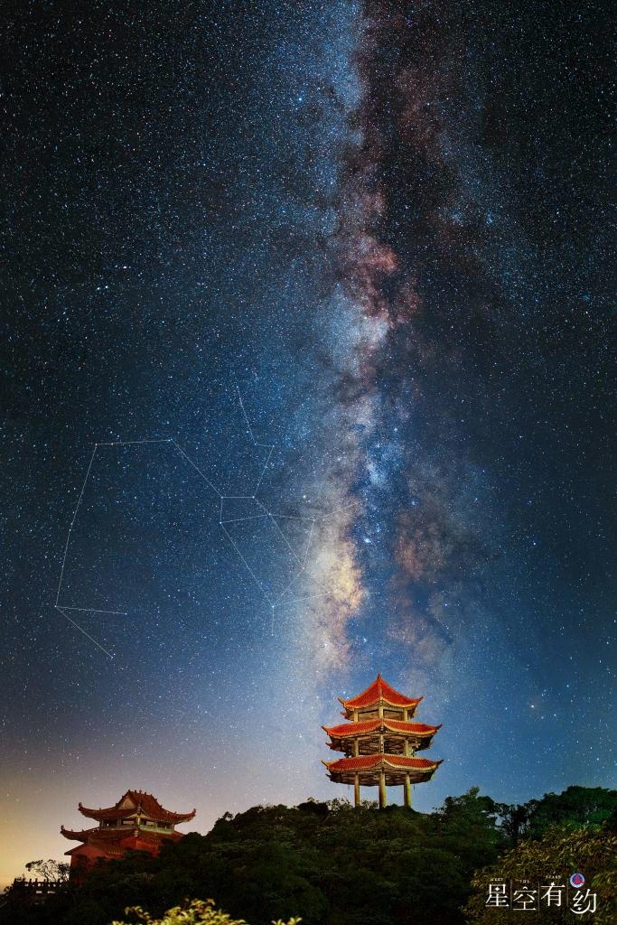 第一个出场的是飞马座。中国天文学会会员、天文科普专家修立鹏介绍,在飞马座中,值得一提的是由仙女座的α星(壁宿二)和飞马座的α星(室宿一)、β星(室宿二)、γ星(壁宿一)共同组成的四边形,也被称为“秋季四边形”。“飞马当空,银河斜挂”,是秋季星空的象征。