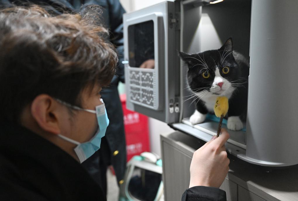 在中铁快运郑州东站营业部宠物交接区,一只小猫进入高铁宠物运输专用箱等待托运,宠物主人与其互动。新华社记者 郝源 摄
