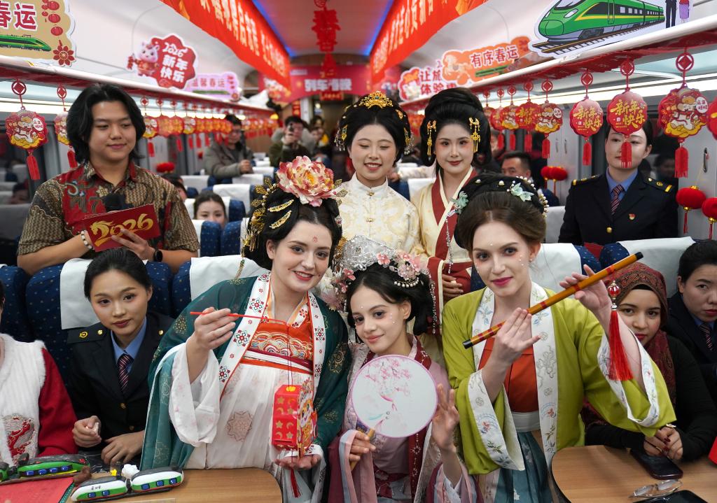 2月10日,列车工作人员与外国留学生为旅客展示汉服。新华社记者 万象 摄