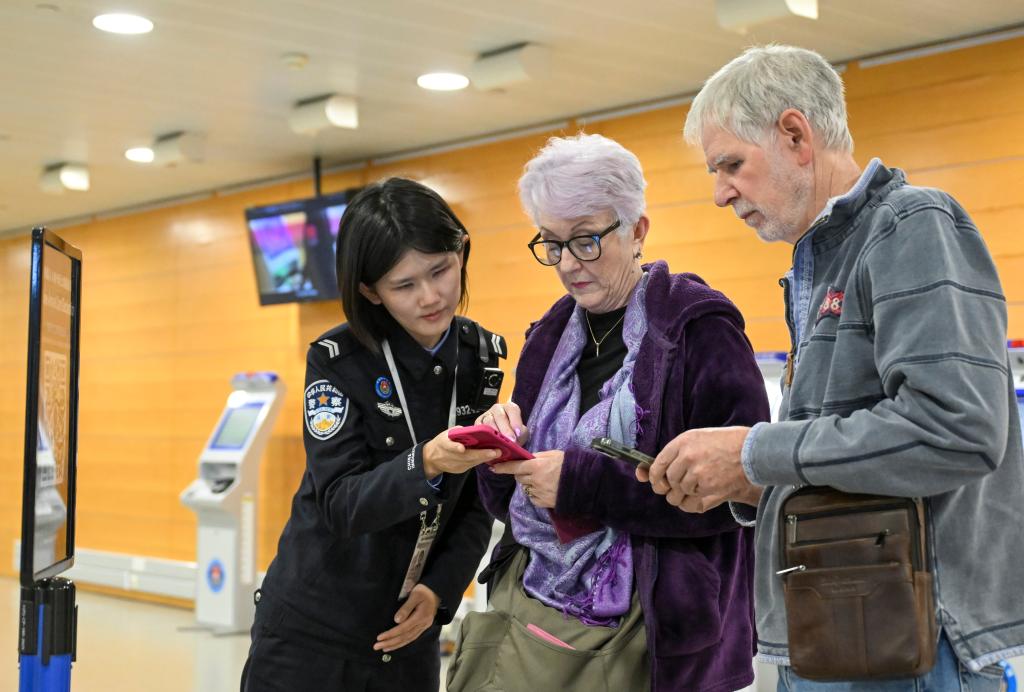 在上海浦东国际机场口岸,边检民警帮助外国游客填写入境信息。新华社记者 陈浩明 摄
