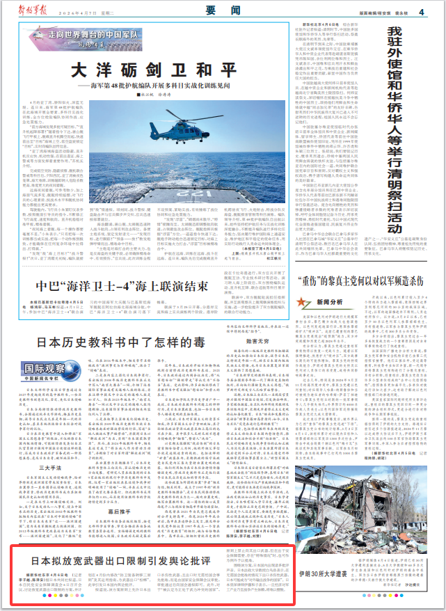 据新华社东京4月6日电 (记者李子越、陈泽安)据日本共同社报道,日本自民党安全保障调查会6日召开会议,讨论放宽武器出口限制的方案,并计划在4月份内修改“防卫装备转移三原则”及其运用指南,为武器出口“松绑”。此举引发日本国内舆论批评。
