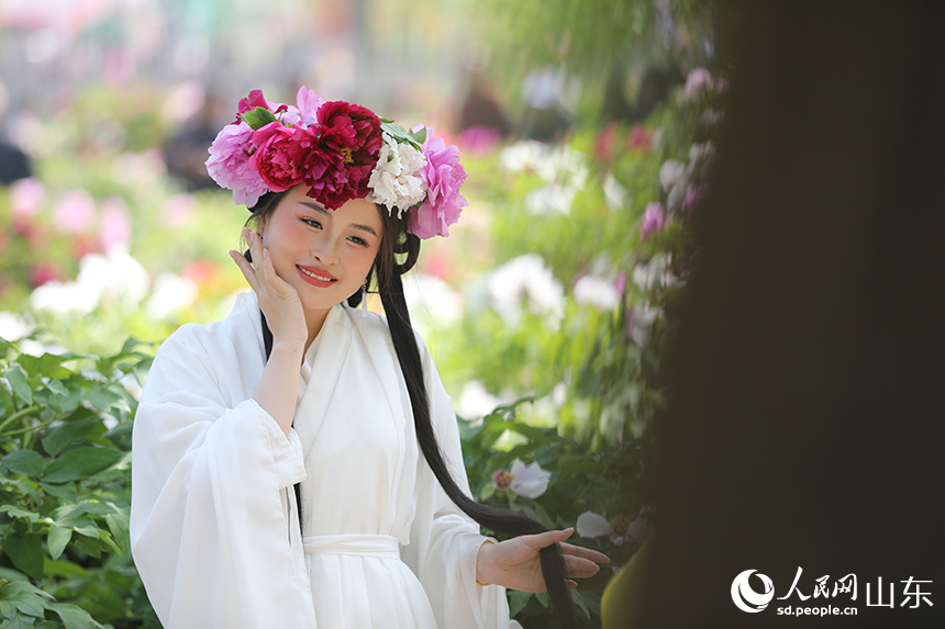 游客头戴牡丹花冠,纷纷拍照打卡。人民网记者 宋翠摄