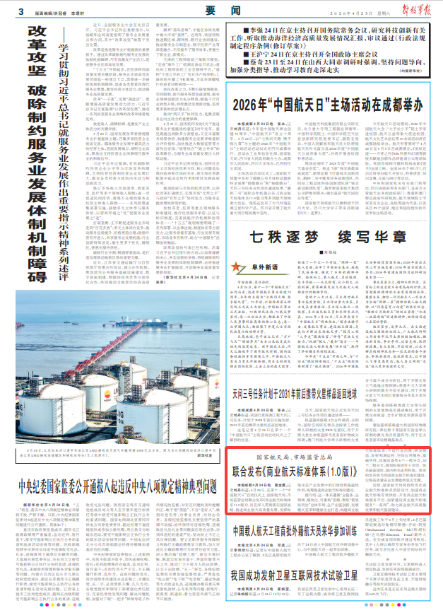 解放军报成都4月24日电 蔡金曼、记者刘丹报道:4月24日,在第十一个“中国航天日”启动仪式上,国家航天局、市场监管总局联合发布《商业航天标准体系(1.0版)》,旨在深入贯彻落实国家战略,推进商业航天高质量发展,发挥标准化在产业发展中的引领性和基础性作用,统筹推进商业航天标准化建设。