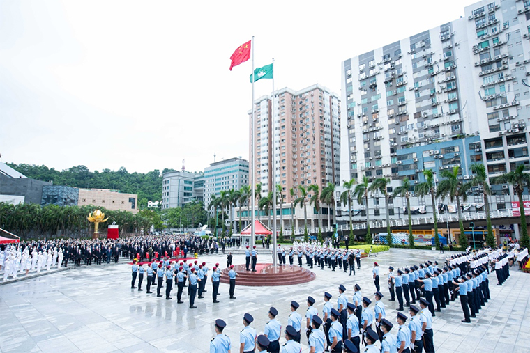 上午8时,澳门特区政府在金莲花广场隆重举行升旗仪式。观礼代表和澳门市民、游客一道观看了升旗仪式。在大家的注视中,鲜艳的五星红旗和澳门特区区旗迎着晨风,徐徐上升。