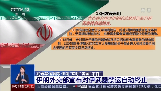 伊朗外交部18日发表声明,宣布联合国对伊朗的武器禁运即日起无条件自动终止。声明说,伊核问题全面协议中明确规定,终止对伊武器禁运是无条件的,无需通过新的协议,也无需安理会声明或采取任何新的措施。