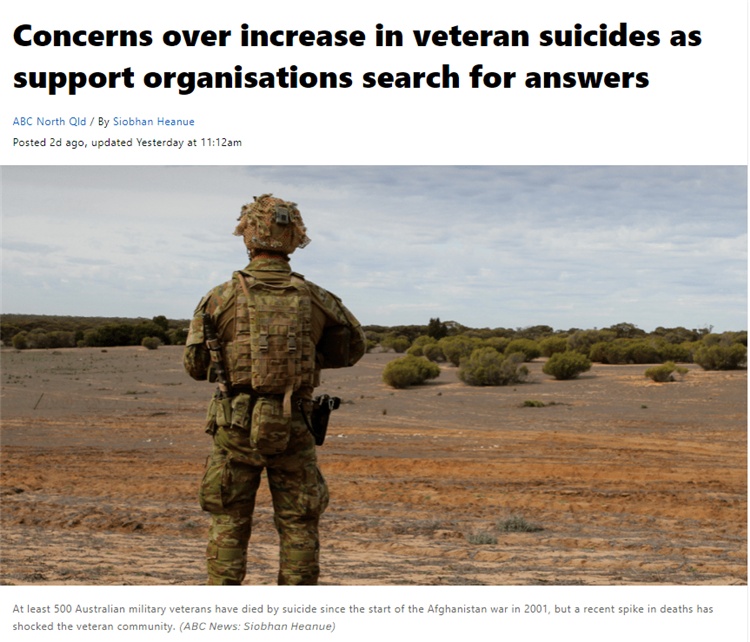 澳大利亚广播公司(ABC)日前报道称,美国发动阿富汗战争近20年来,参加驻阿联军的澳大利亚部队中至少已有500名士兵自杀,是澳军在阿富汗阵亡人数的10倍以上。过去两个月,澳军自杀事件频发,包括至少10名退役士兵。