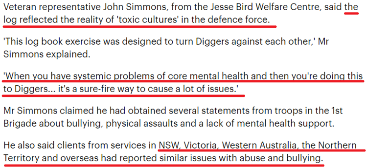 从事军人福利工作的澳军退伍老兵约翰·西蒙斯指出,这份日志反映了澳国防军中“有毒文化”泛滥的现实。“当你的核心心理健康出现系统性问题,就会对同伴们干出这些事来……这肯定会引发很多问题。”