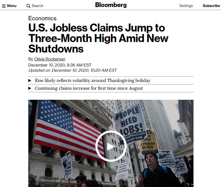 彭博社分析称,美国首次申请失业救济人数仍保持在疫情暴发前水平的3至4倍,如今由于疫情恶化导致对餐饮和其他人员接触密切行业的新限制措施陆续出台,可能导致未来几周劳动力市场复苏持续乏力。尽管本月内首批实施的疫苗接种可能有助于遏制疫情扩散并缓和限制措施,但疫苗大规模普及尚需几个月的时间,短期效果有限。