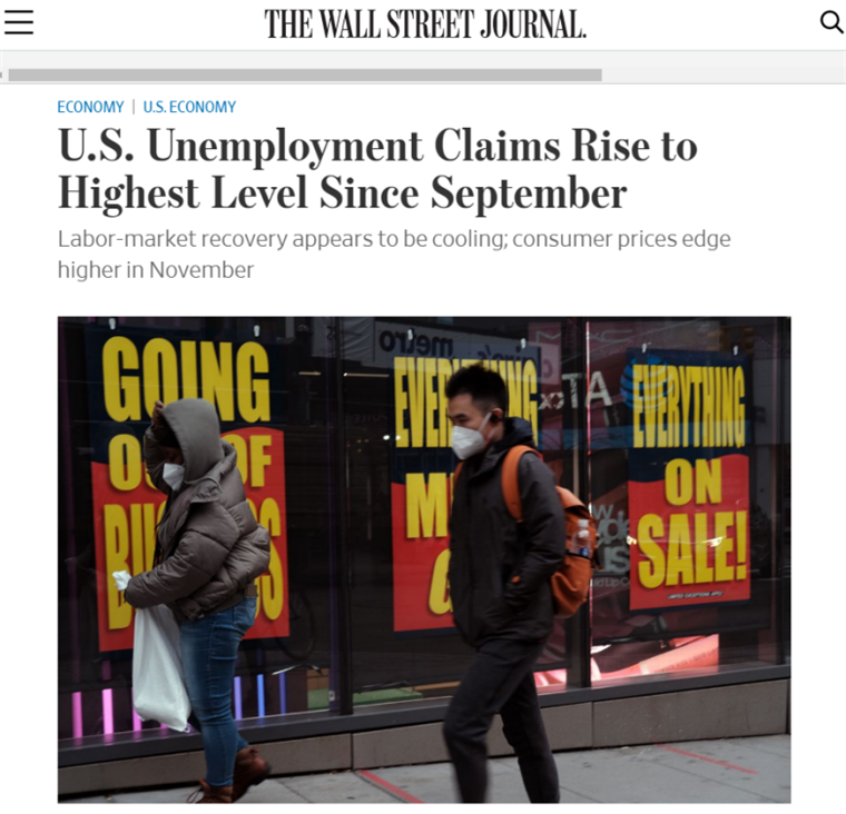 △《华尔街日报》称,美国首次申请失业救济人数升至9月以来最高水平,劳动力市场复苏正在降温