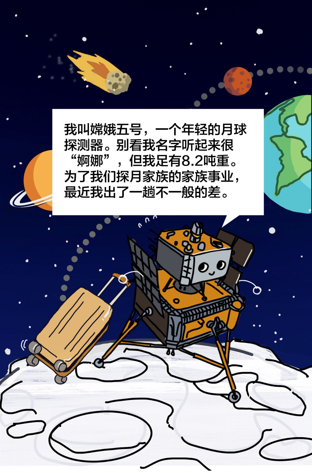 我叫嫦娥五号探测器,一个年轻的胖子。别看我名字听起来很“婀娜”,但我足有8.2吨重,论吨位可是我们国家今年“上天”的小伙伴中的翘楚。