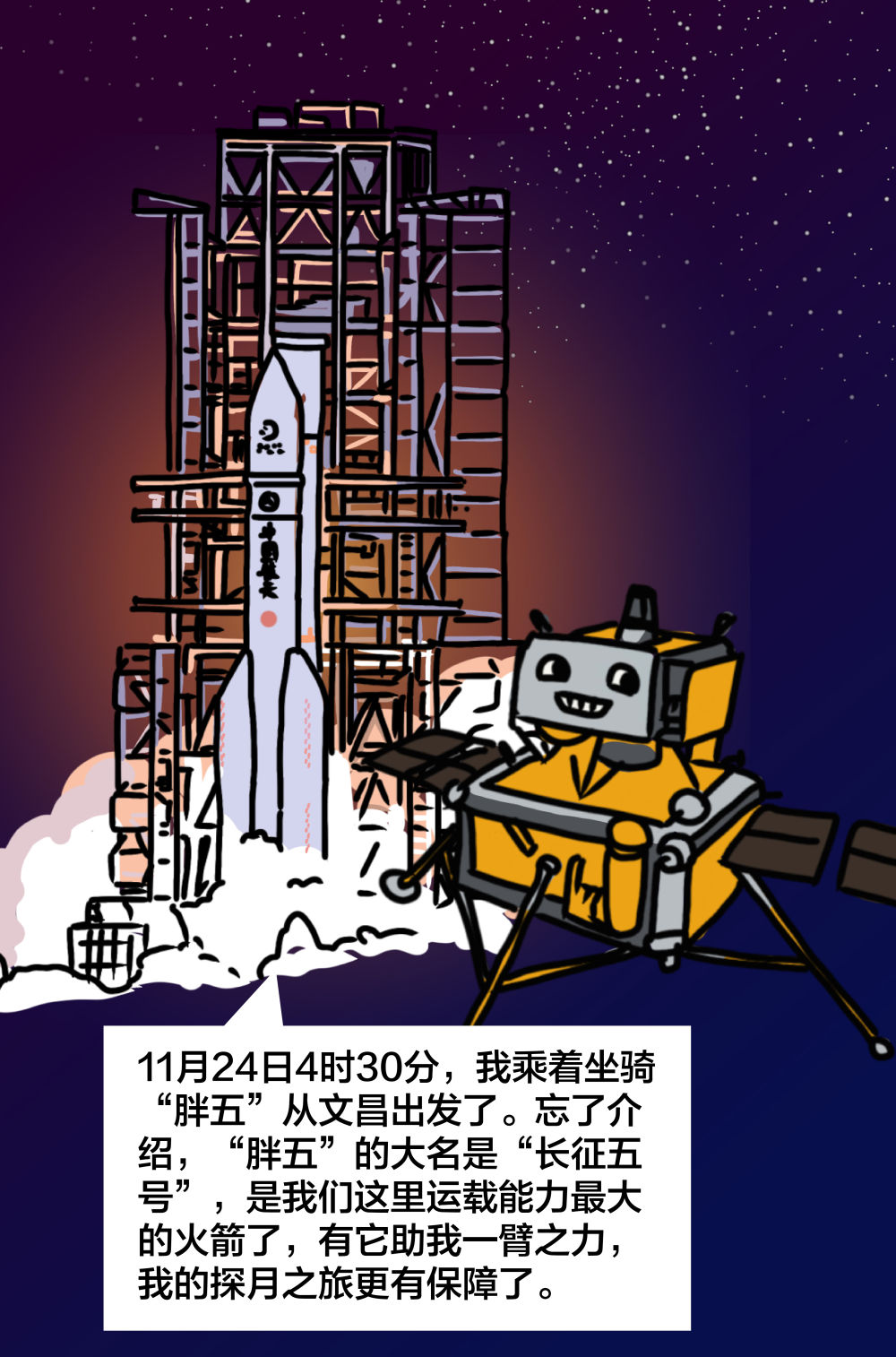 不多说了,11月24日4时30分,我乘着坐骑“胖五”从文昌出发了。哦忘了介绍,“胖五”的大名是“长征五号”,是我们这里运载能力最大的火箭了,有它助我一臂之力,我的探月之旅更有保障了。