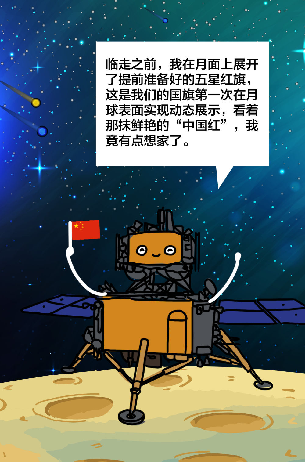 还好我没有忙晕,临走之前,我在月面上展开了提前准备好的五星红旗,这是我们的国旗第一次在月球表面实现动态展示,看着那抹鲜艳的“中国红”,我竟有点想家了。