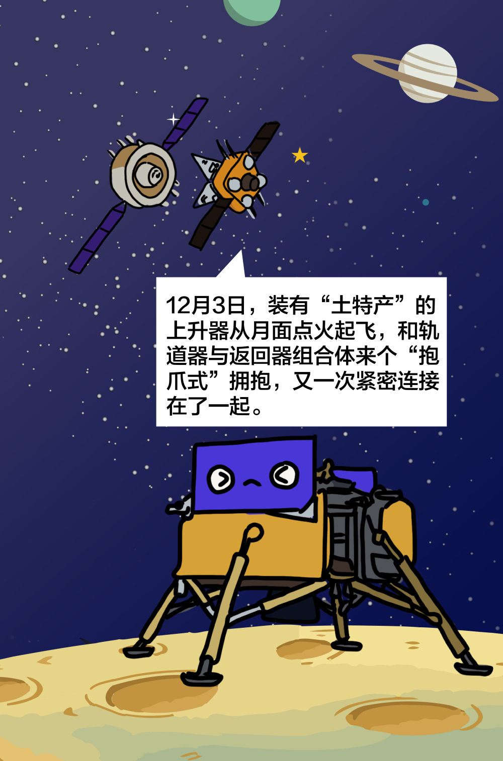 12月3日23时10分,我带着装有“土特产”的上升器从月面点火起飞,顺利进入了预定的环月轨道,而待命多时的轨道器和返回器组合体早就等在那里了。通过世界首创的“抱爪式”对接技术,我们来了个小别重逢后的拥抱,又一次紧密连接在了一起。