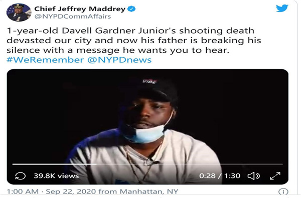 在纽约的一个游乐园附近,年仅1岁的小德瓦尔·加德纳腹部中弹,死在婴儿车中。他的父亲在网上满怀悲痛地呼吁结束枪支暴力。图片来源:纽约市警察局官方推特截图