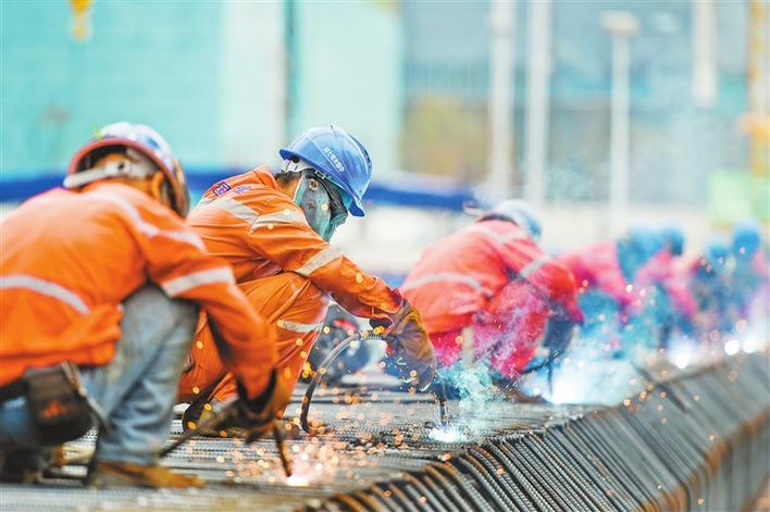 穗莞深城际铁路前海站施工现场,工人正焊接钢筋笼。深圳特区报记者 刘羽洁 摄