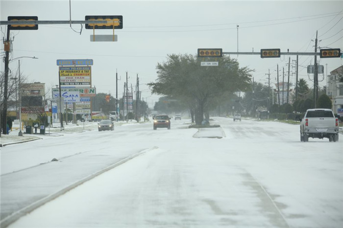 2月15日,在美国得克萨斯州休斯敦,车辆在积雪的道路上行驶。受极地寒流影响,美国南部得克萨斯州部分地区14日夜间开始遭遇冬季风暴,造成路面结冰、道路被封以及大面积停电。(新华社发,劳承跃摄)