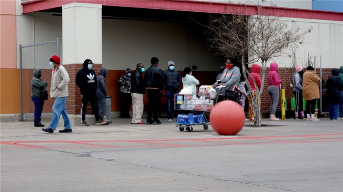 2月18日,人们在美国得克萨斯州休斯敦市排队等待进入一家超市购物。罕见的冬季风暴日前造成美国南部得克萨斯州多处停电。受低温及停电影响,得州食品供应链也受到冲击。全州范围内,一些超市因停电关门,部分居民不得不靠囤积的罐头食品度日。(新华社发,劳承跃摄)