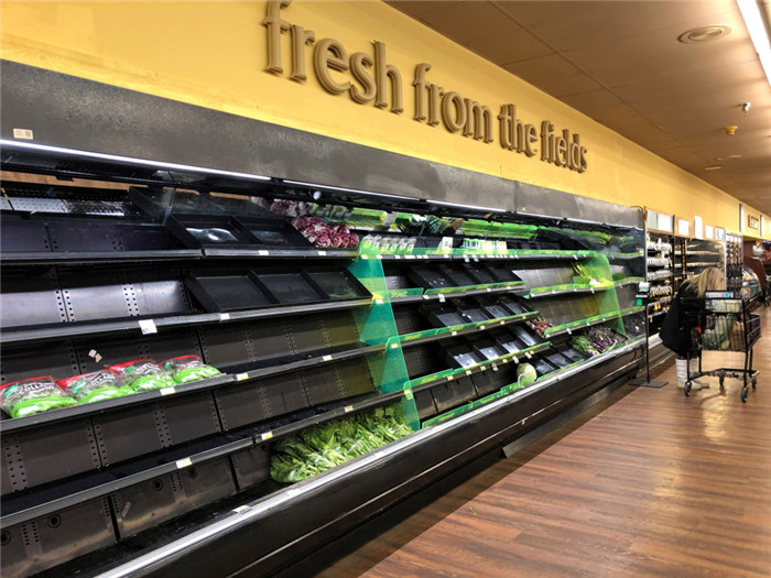 2月19日,在美国得克萨斯州达拉斯市北郊的一家超市,蔬菜货架上的货物寥寥无几。受极地寒流影响,得克萨斯州部分地区14日夜间开始遭遇降雪、冰凌、冻雨等,造成路面结冰、道路被封以及大面积停电。(新华社发,田丹摄)