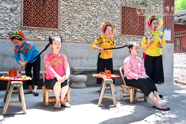 接着在髻心周围、左右对称插上几支大红、桃红艳丽的簪花、绢花或鲜花,再插上金或银制成的双脚发钗或梳子。整个头上打扮得犹如一座春意盎然的小花坛,美丽芬芳。