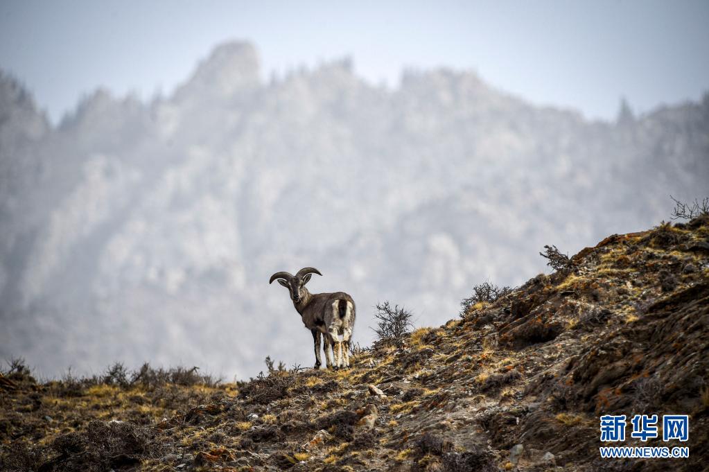 一只岩羊站立在宁夏贺兰山国家级自然保护区的峭壁上(2019年3月27日摄)。新华社记者 冯开华 摄