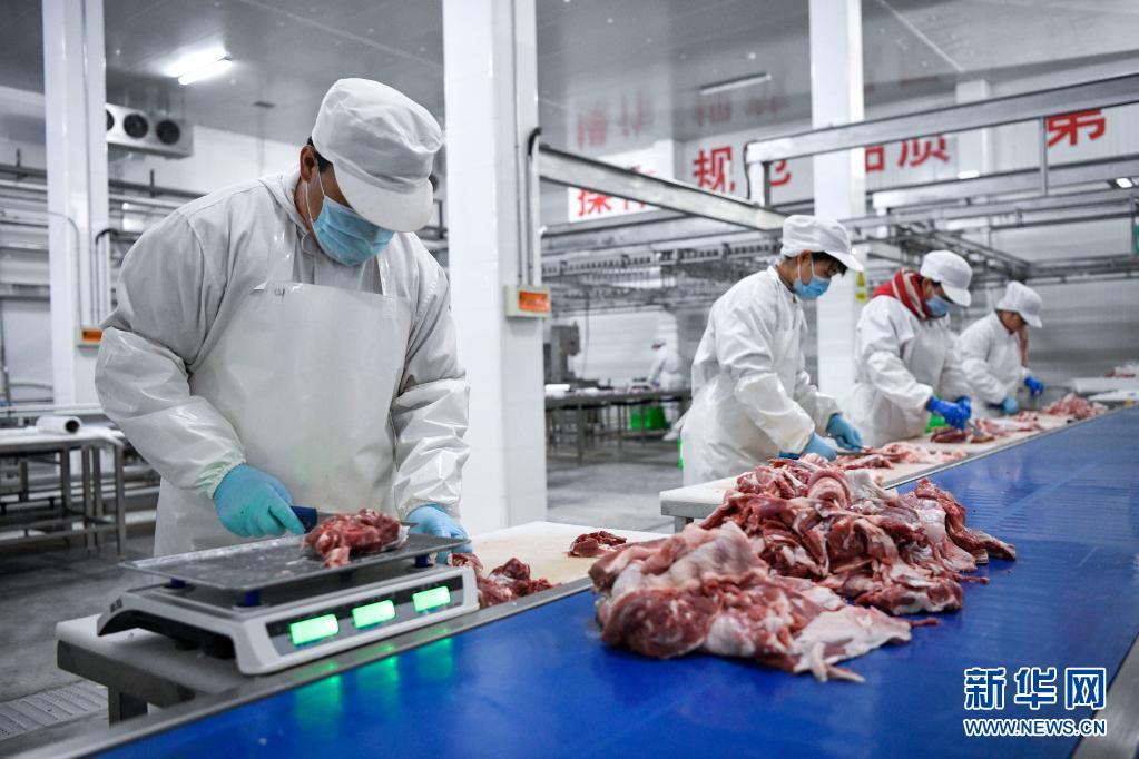 在宁夏盐池滩羊集团的高标准屠宰加工厂内,工人在精细分割滩羊肉(2020年11月2日摄)。新华社记者 冯开华 摄